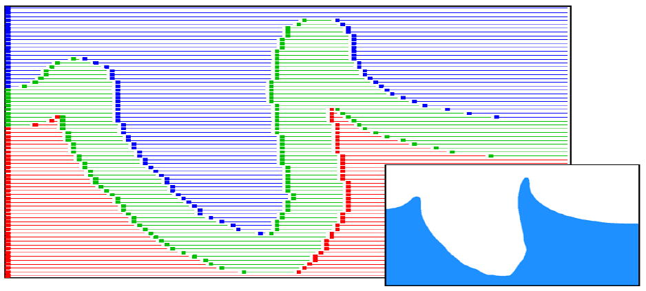 The RLE (run-length encoded) sparse level set is a novel scalable level set representation. This compact level set representation, and it's ability to represent animated characters, was used in the creation of the "Tar Monster" CG character featured in the movie Scooby Doo 2. (Please note: this web write-up contains more accurate O-notations than given in the sketch below.) A. The RLE Sparse Level Set Structure The novel RLE sparse level set representation has many beneficial characteristics: